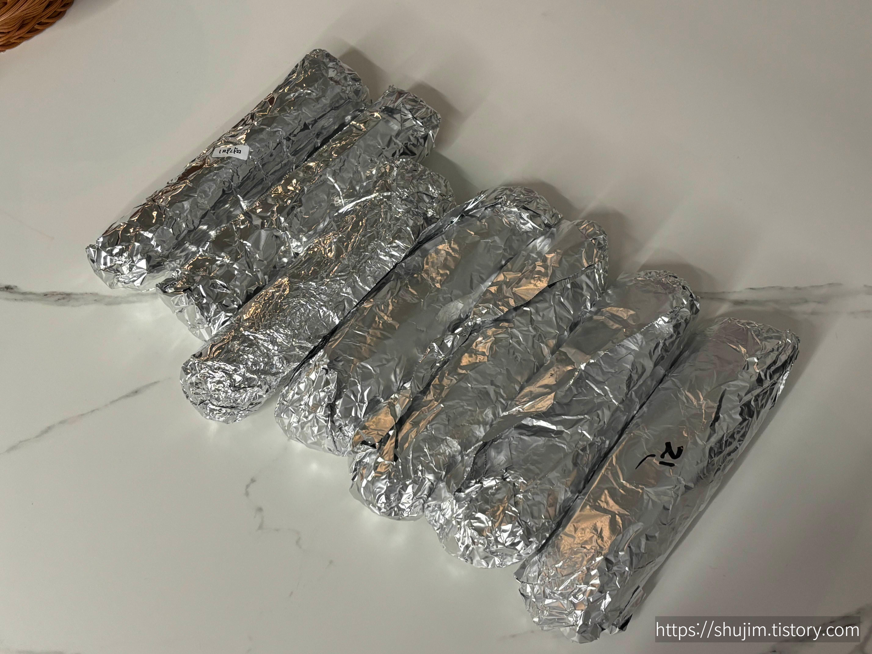 오는정김밥에서 오리지널 4줄 떡갈비김밥, 깻잎김밥 1줄씩 총 6줄