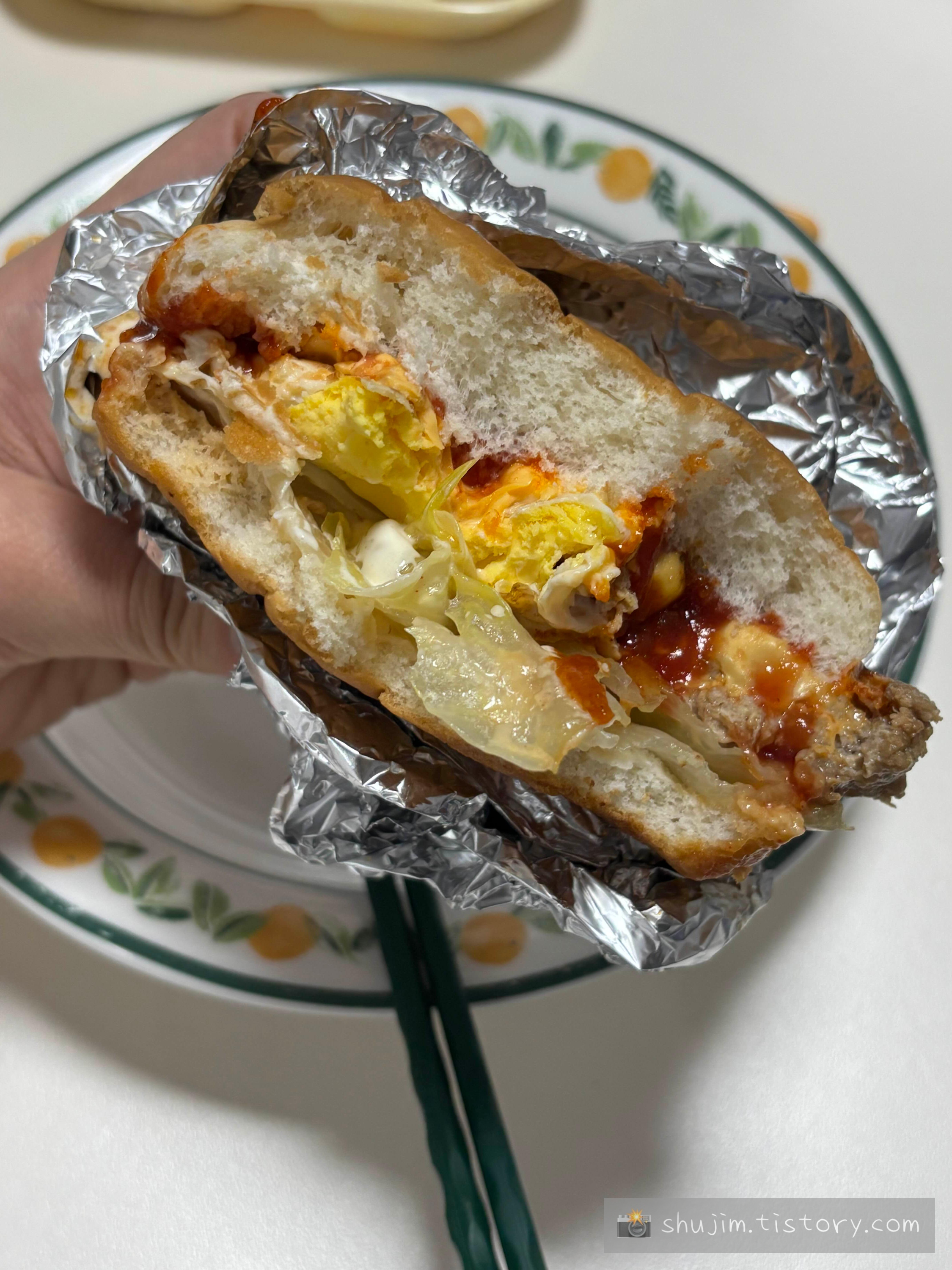 달걀후라이 패티 양배추 소스가 잔뜩 들어있는