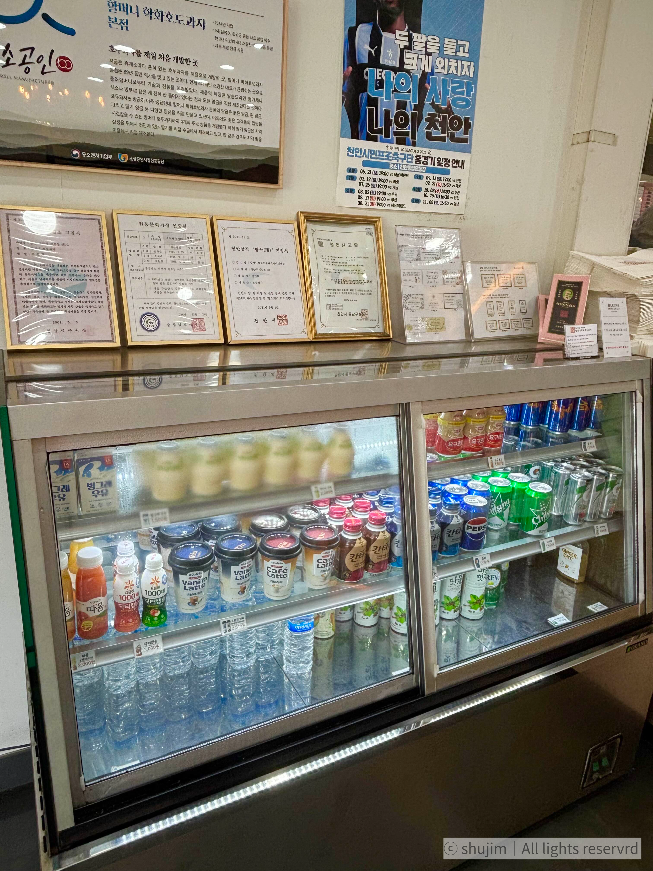 할머니학화호도과자는 호도과자 전문점이라, 매장에서는 음료가 따로 제공되지 않고 한쪽 냉장고에서 직접 골라 계산해야 해요.