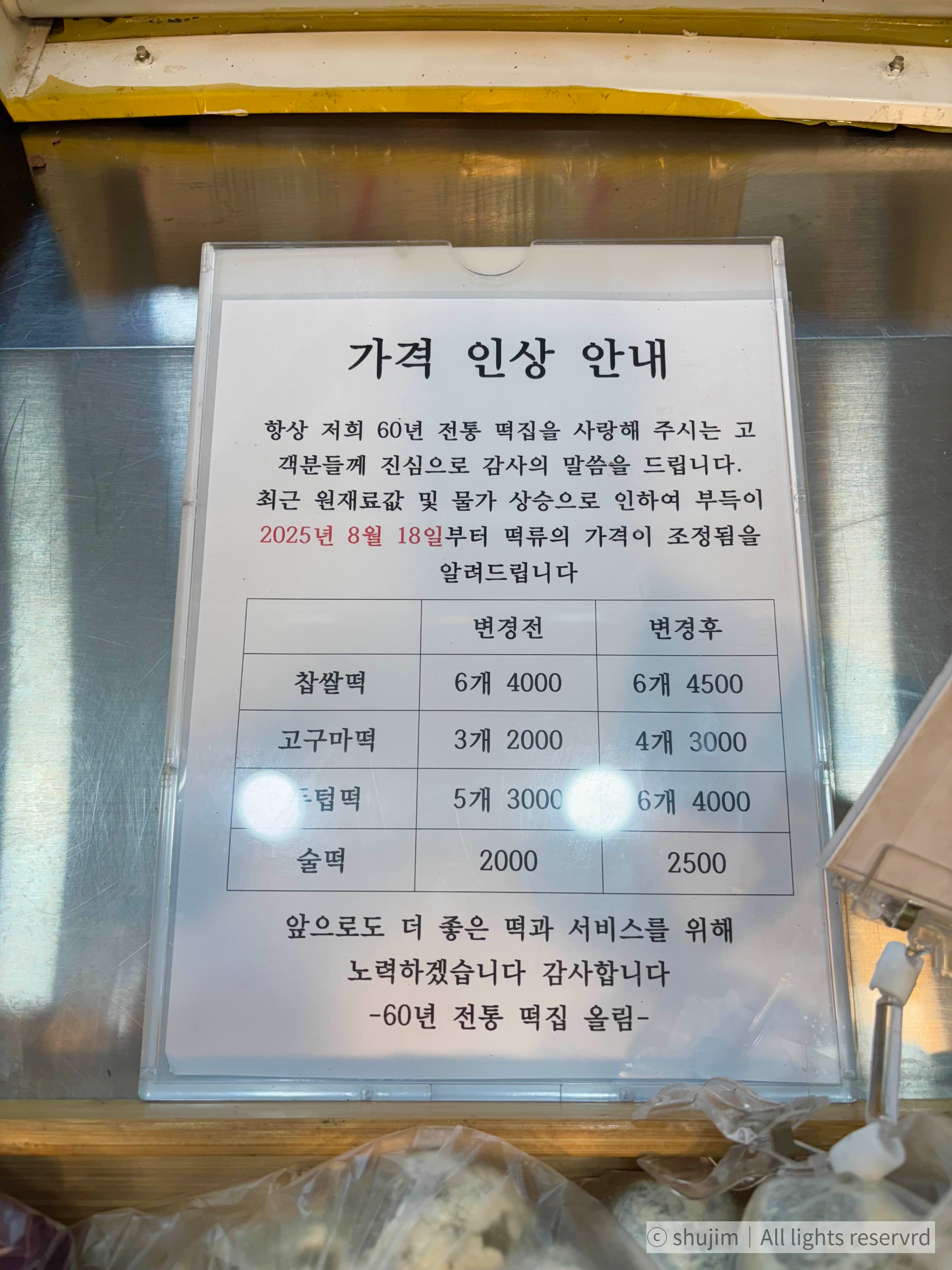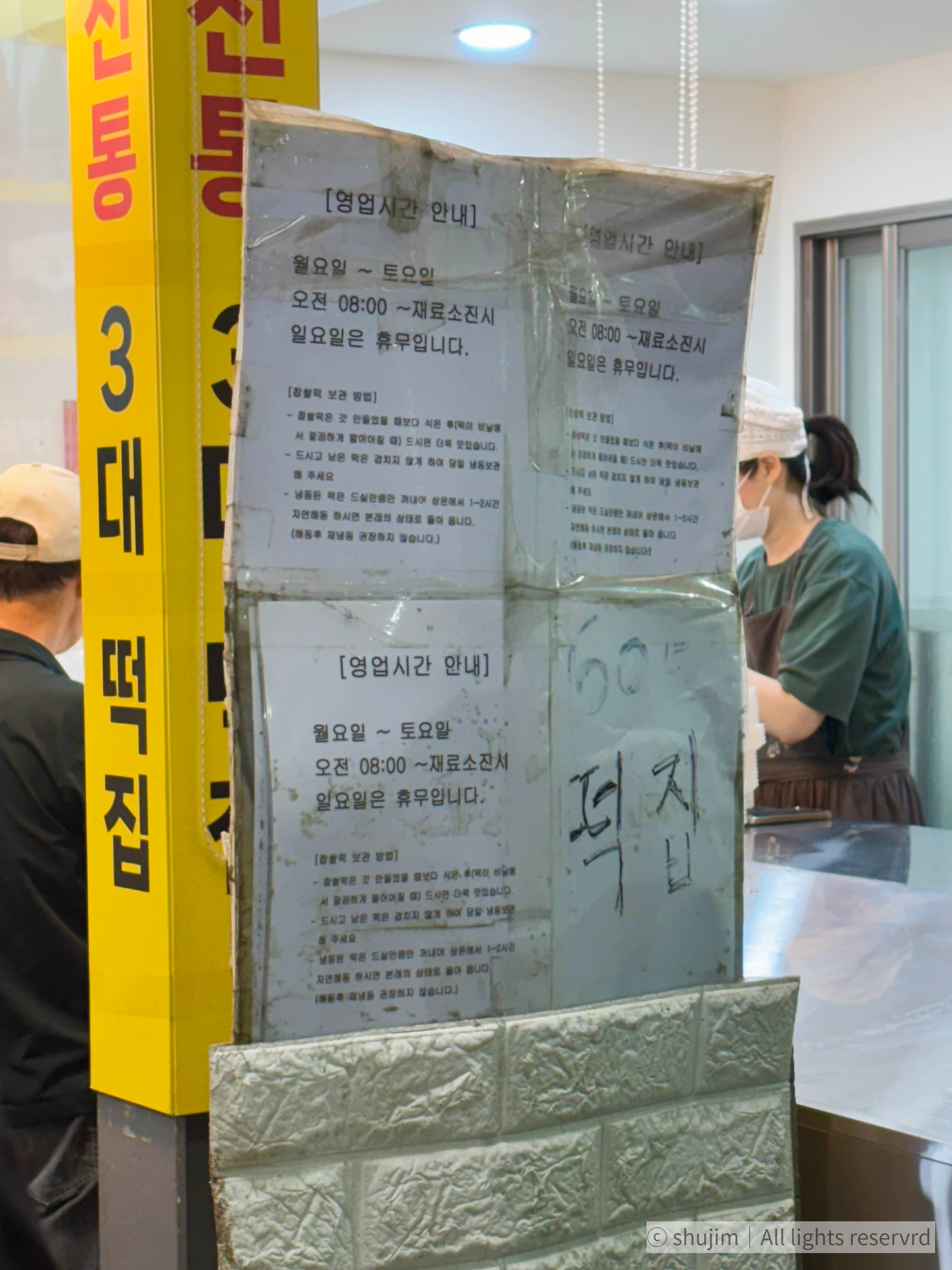 입구에 붙어 있던 터프한 안내문구. 괜히 전통 맛집다운 자신감이 느껴져서 웃음이 났어요. 기다리면서 안쪽을 보니 하나둘 떡이 쌓여가고, 그 모습만 봐도 벌써부터 침이 꼴깍 넘어갔습니다.