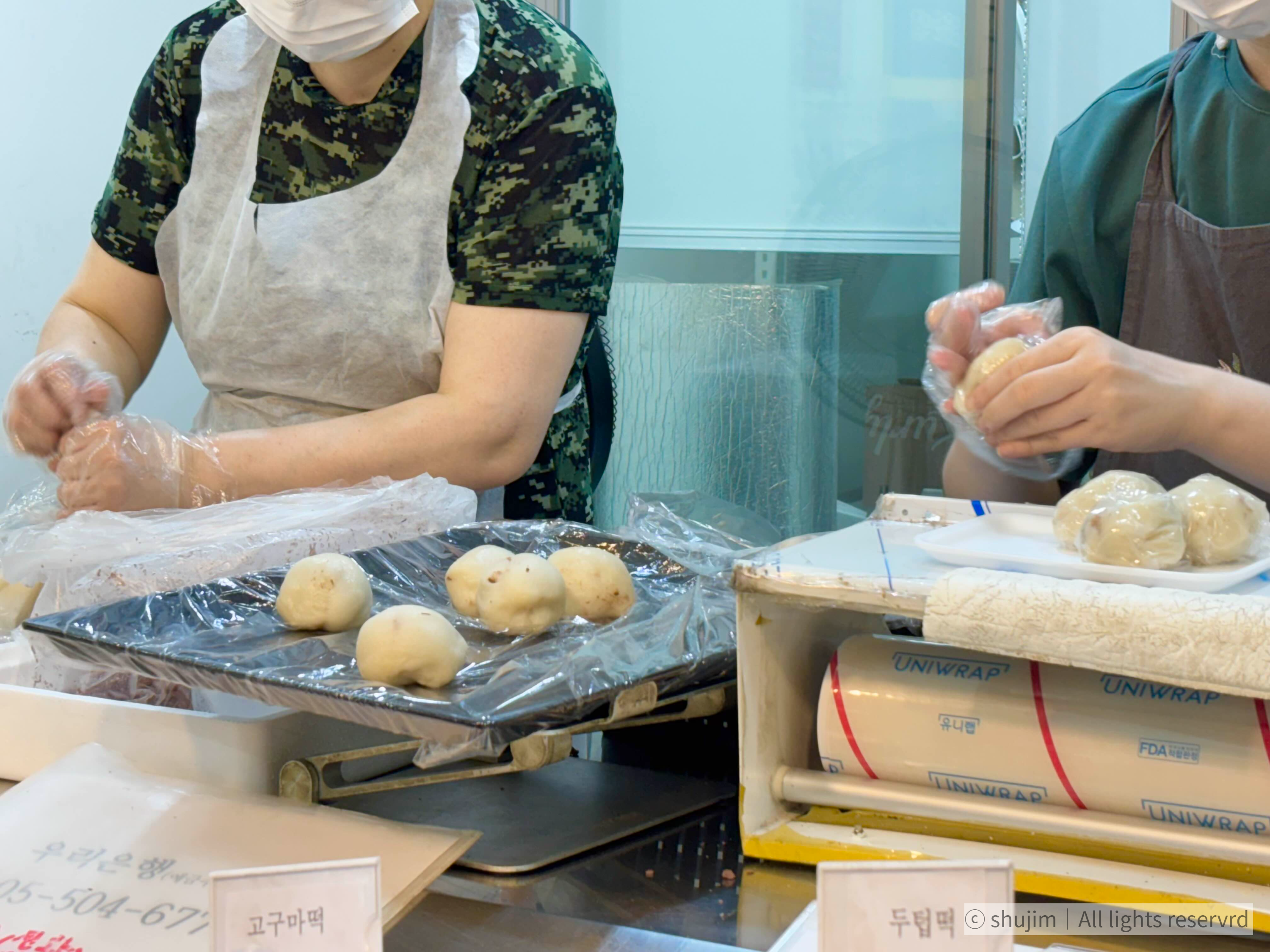 고구마떡은 찹쌀떡보다 살짝 더 달았는데, 고구마 특유의 부드럽고 달큰한 풍미가 잘 살아 있어서 이것도 인기 있을 만하더라구요. 저는 사실 고구마 간식은 크게 좋아하지 않는 편인데, 친구는 엄청 만족하며 먹었답니다.